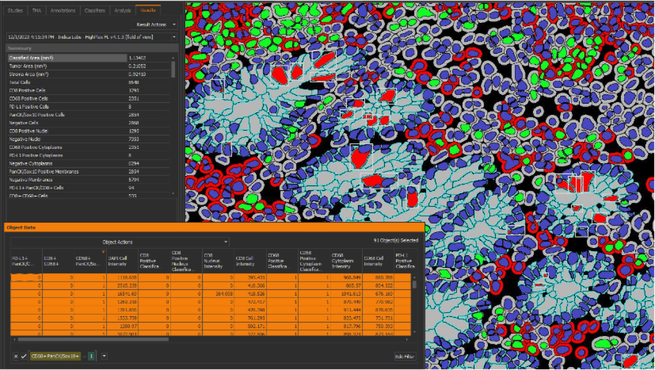 可量化细胞质和/或细胞核中多达三种免疫荧光 (IF) 标记物的表达。可根据染色强度(1+、2+ 和 3+)分别计算出各种染色强度的细胞个数,百分比以及染色共表达的细胞个数,百分比
