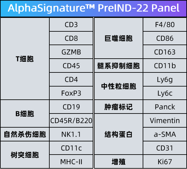 AlphaSignature™ PreIND-22 Panel涵盖重要的免疫细胞谱系和结构标记,用于肿瘤微环境中关键免疫细胞类型的空间表型分析和细胞通讯。通过小鼠和人类模型间的高级比较研究来加深对癌症生物学的理解,扩大空间生物学在药物开发关键阶段的影响,提供在治疗管道早期探索关键生物学见解的工具,增强其临床前研究的转化潜力。
