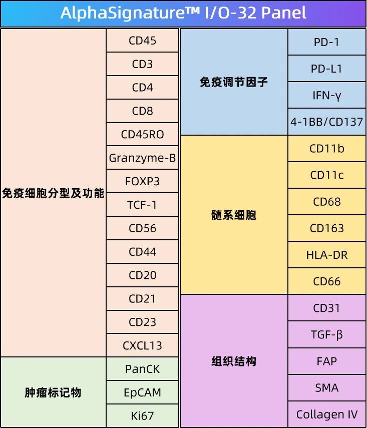 AlphaSignature™ I/O-32 Panel涵盖主要的免疫细胞类型和关键免疫检查点。方便用户分析免疫细胞多样性、评估关键免疫检査点、了解肿瘤微环境成分和探究已知免疫治疗靶点的可能性,为开发精确疗法和推进免疫治疗提供依据。