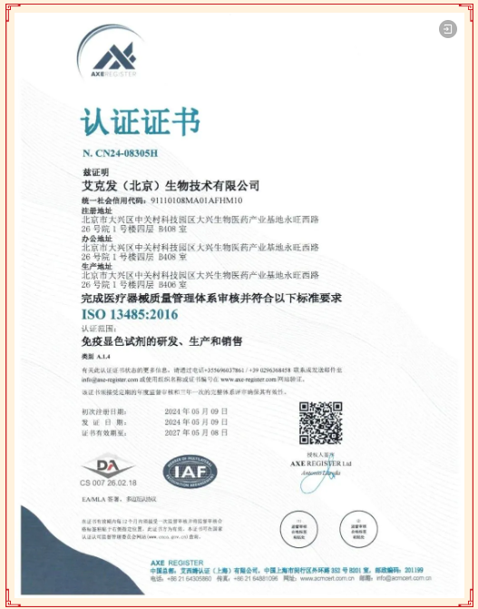 2024年5月9日,艾克发生物获得“ISO 13485”医疗器械质量管理体系认证证书。此次认证的顺利通过,表明了艾克发生物具备了与国际接轨的管理体系,这将成为高质量的产品和服务的保证,增强产品的竞争力,提高产品的市场占有率,取得进入国际市场的通行证,使企业获取更大的经济效益。