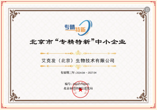 2024年4月28日,艾克发生物顺利通过北京市“专精特新”中小企业认定,这也是艾克发生物继国家高新技术企业、中关村高新技术企业、知识产权试点单位之后,获得的又一项重要资质。