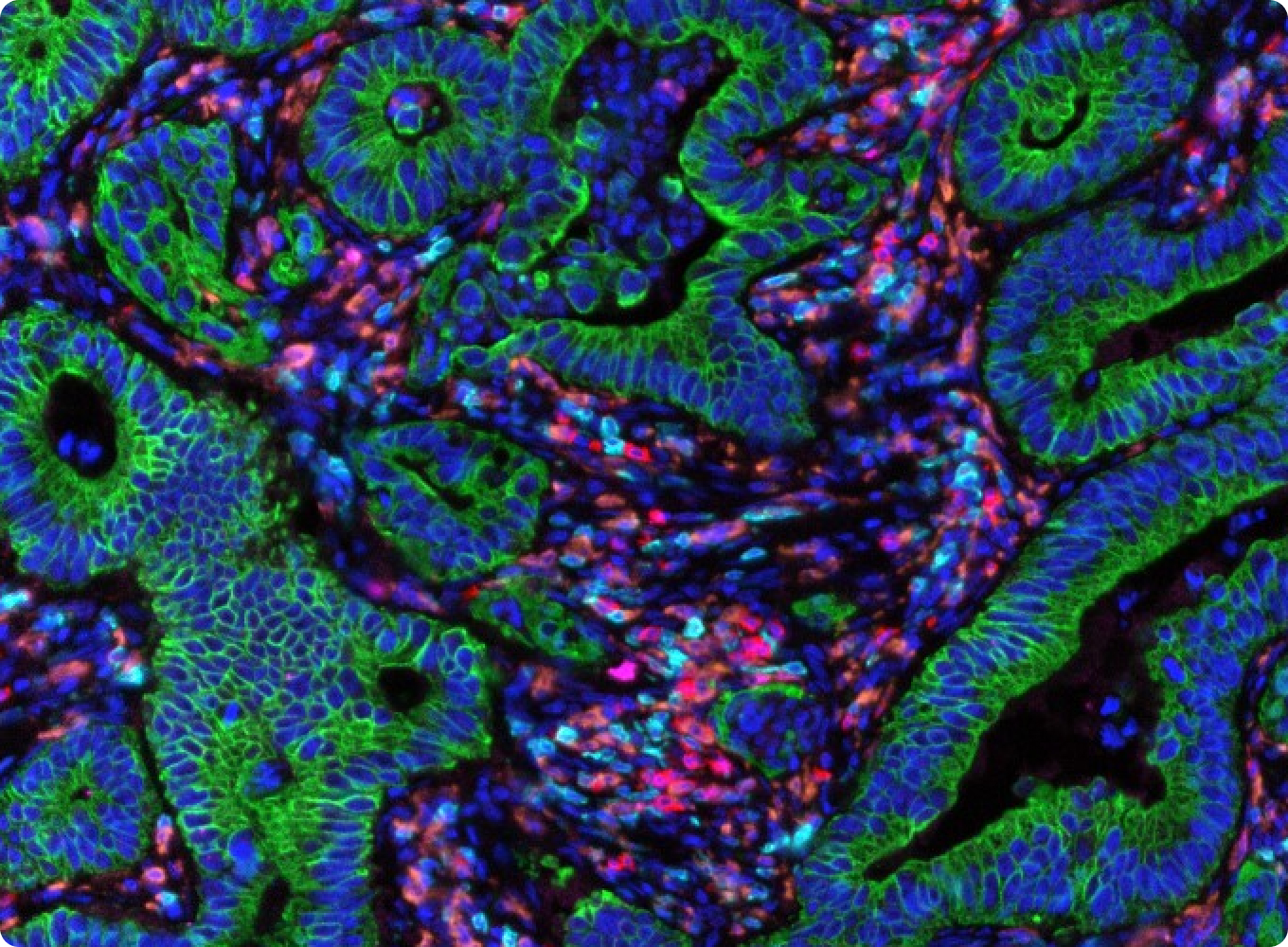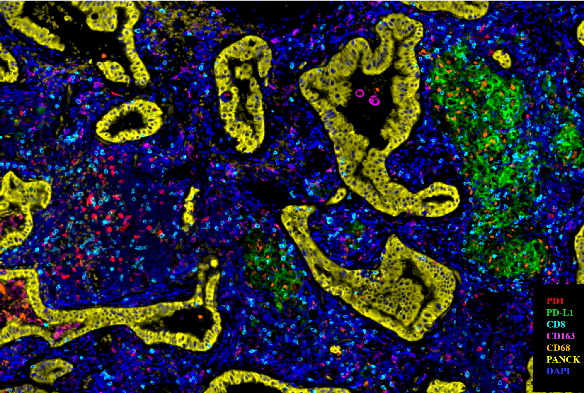 mIHC在一张组织样本上复染多种分子标记,将多元信息呈现在同一画面内,配合特定软件进行全面分析,原位评估免疫细胞表型,获得各靶标数量、密度、百分比等数据,探寻组织微环境中的目标分子或不同类群细胞间的相互关系。这对于研究疾病的发生发展转移机制,探讨疾病诊断和治疗具有重要意义。