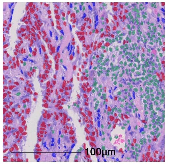 (红色-肿瘤细胞,绿色-淋巴细胞,蓝色-其他表型细胞)