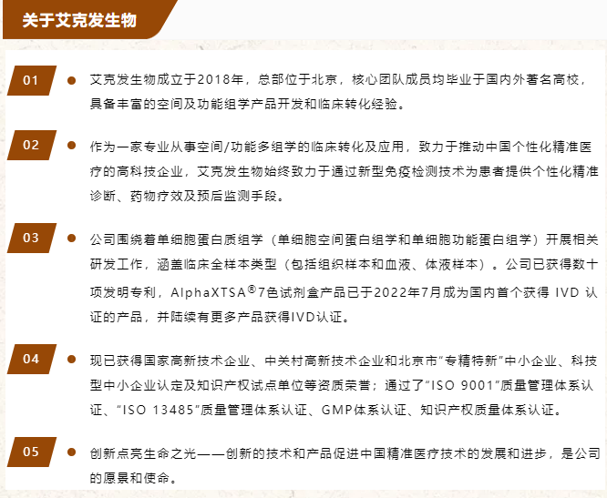 艾克发生物致力于为客户提供mIHC一站式解决方案,并且联合搭建了空间/原位转录组平台,更好的为客户提供全方位的检测服务——AlphaXTSA®多靶点免疫组化染色试剂盒(点击进入链接)以优良的染色性能和超高的实验效率完美助力研究进程!更有艾克发生物推出的AE系列服务加持(点击进入链接),检测方案包含34个高证据等级marker及完全定制型panel,纳入免疫相关众多关键代表性指标,更好地提示患者预后或指导治疗。