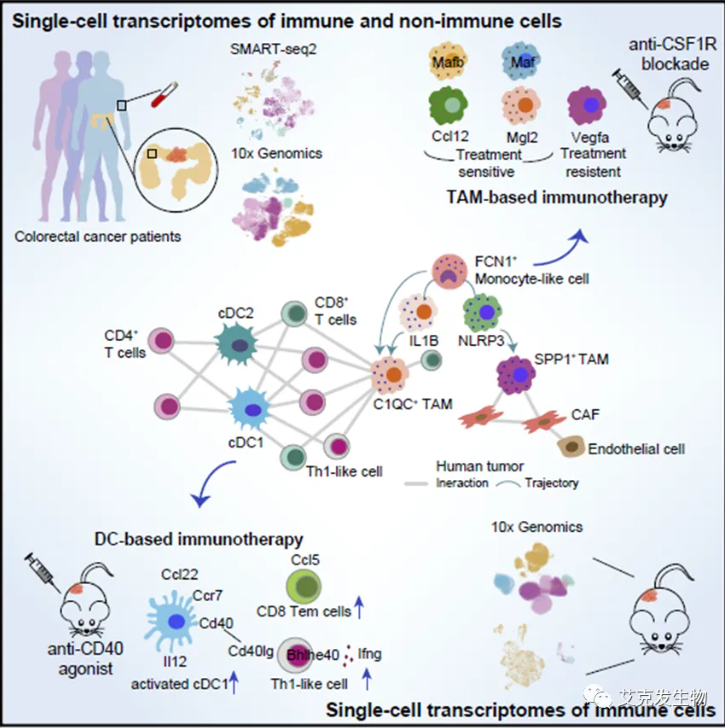 2020年是张老师科研产出较高的一年,其中包括1篇Cell,1篇Nature,1篇Cell research和2篇Nature Communications。着重为大家介绍的是发表在Cell上名为“Single-Cell Analyses Inform Mechanisms of Myeloid-Targeted Therapies in Colon Cancer”的论文[5]。研究通过单细胞测序技术对CRC患者肿瘤组织免疫细胞亚群进行了分析,鉴定出了TME中细胞-细胞相互作用中发挥关键作用的特定TAMs亚群和DCs亚群,首次通过泛癌分析刻画了肿瘤浸润髓系细胞在不同癌种内的特征图谱,并系统性地对比了各类髓系细胞类群在不同癌种内组成和功能上的差异。