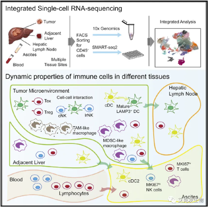 2019年底,研究名为Landscape and Dynamics of Single Immune Cells in Hepatocellular Carcinoma[4]发表在Cell上,也可作为一篇做肿瘤免疫的范本,特别是对使用单细胞技术揭示TME的研究提供了很多的借鉴。该研究通过整合SMART-seq2和10x Genomics Chromium 3’两种单细胞测序的数据,充分发挥不同数据类型的优势,获得高分辨率的肝癌免疫图谱,揭示肝癌免疫微环境的动态特征。