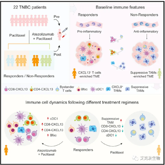 同年发在Cancer Cell上的一篇名为Single-cell analyses reveal key immune cell subsets associated with response to PD-L1 blockade in triple-negative breast cancer的文章研究的是三阴性乳腺癌(TNBC)PD-L1阻断反应相关的关键免疫细胞亚群的研究[8],提出了紫杉醇与阿替唑珠联合治疗TNBC的潜在缺陷,为TNBC的免疫治疗和精准治疗提供了新的见解。