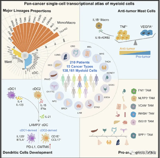 不得不提的利用纯单细胞数据挖掘就能发表在Cell杂志上的名为A pan-cancer single-cell transcriptional atlas of tumor infiltrating myeloid cells的文章[7]。该研究在单细胞水平对15个癌种内肿瘤进展的关键调节因子——肿瘤浸润髓系细胞(TIMs)进行了系统性的刻画,比较了肥大细胞、树突状细胞以及肿瘤相关巨噬细胞在不同癌种内的特性,为靶向不同癌种内髓系细胞的免疫治疗提供了重要依据。(另一篇Cell是做的新冠研究,艾发发同学在此未赘述)