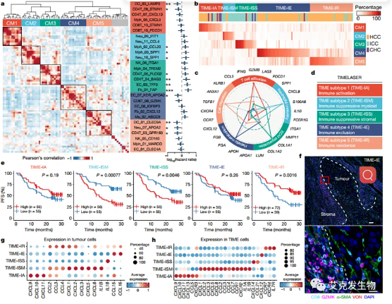 同年,张老师团队最厉害的一篇文章是在Nature发表了题为 Liver tumor immune microenvironment subtypes and neutrophil heterogeneity 的研究论文[10]。该研究首次在单细胞精度定义了肝癌的五种免疫微环境亚型(TIMELASER),探究了其细胞组成、空间分布、基因组特征和趋化因子受体-配体网络,首次全面揭示肿瘤相关中性粒细胞(TAN)的异质性并通过多重免疫组化(mIHC)进行验证,为肝癌及其他实体瘤的基础研究和临床诊疗提供了关键信息。