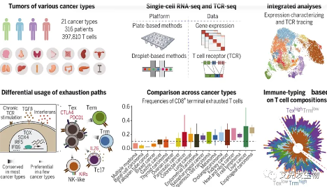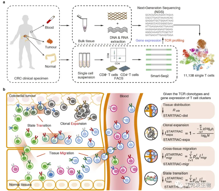 2018年张老师推出STARTRAC(Single T-cell Analysis by Rna-seq and Tcr TRACking)生物信息分析方法,在Nature杂志发表了题为Lineage tracking reveals dynamic relationships of T cells in colorectal cancer的研究论文[3]。该算法属于国际领先的开创性工作,研究对在12位结直肠癌(CRC)病人中获取的11,138个单个T细胞的组织分布特性、克隆性、迁移性和状态变化特性进行了系统性地定量刻画,是目前对肿瘤浸润T细胞最新颖最深入的研究。不同癌种中T细胞的系统性地比较可能为肿瘤免疫治疗响应的异质性提供指导。