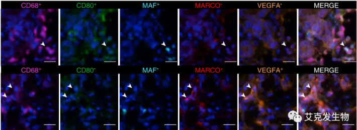 (文中Figure 3. CRC代表图像:上图-CD68+CD80+MAF+TAM,下图-CD68+MARCO+VEGFA+TAM)[5]