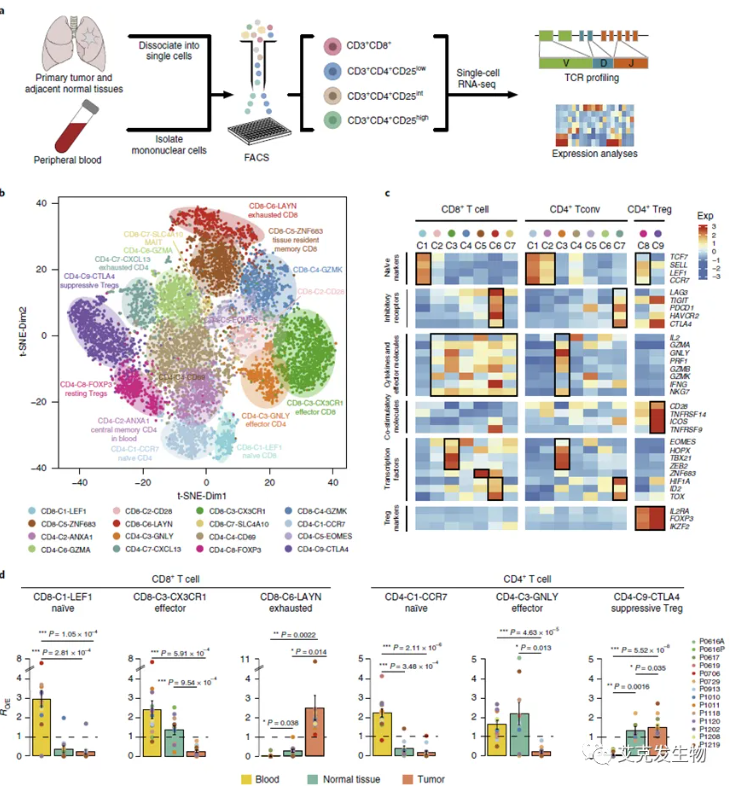 2018年张老师课题组在Nature Medicine上发表Global characterization of T cells in non-small-cell lung cancer by single-cell sequencing文章[2]。其中,对来自14例非小细胞肺癌(NSCLC)初治患者外周血、癌组织及癌旁组织的12,346个的T细胞进行单细胞测序,发现了肿瘤中真正发挥抑制功能的调节性T(Treg)细胞,且激活态Treg的比例与肺腺癌病人的预后相关。该研究为患者分层提供了一种新的方法,将有助于进一步了解肺癌中T细胞的功能状态和动力学。