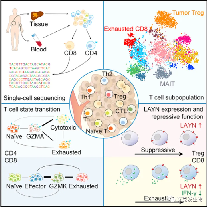 首先介绍的是张老师名声大燥的代表性文章,当属2017年Cell上名为Landscape of Infiltrating T Cells in Liver Cancer Revealed by Single-Cell Sequencing的文章[1]。这项研究可谓是利用单细胞测序技术研究肿瘤免疫微环境(TiME)的经典之作,也是国际上首次大规模针对肝癌相关T细胞的单细胞组学研究,首次在单细胞水平上描绘肝癌微环境中免疫图谱,发现了肝癌免疫疗法的潜在靶点,也为我们从多角度系统性理解肝癌T淋巴细胞特征奠定了基础,为今后其他肿瘤开展类似研究及各类肿瘤免疫发展提供了基础。