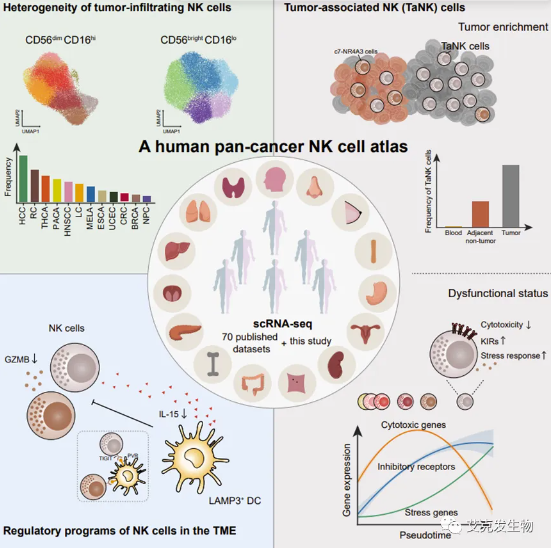 2023年8月21日,张老师课题组在Cell上发表了题为A Pan-Cancer Single Cell Panorama of Human Natural Killer Cells的研究论文[12]。该研究以生物信息学数据整合为支撑,对收集的大规模单细胞转录组测序数据分析,首次在泛癌水平系统地鉴定了5类CD56brightCD16lo和9类CD56dimCD16hi NK细胞亚群,系统刻画了自然杀伤 (NK) 细胞在不同癌症类型和组织之间的异质性,发现了TME特异富集、杀伤功能异常的NK细胞亚类,揭示了NK细胞与微环境中其他组分的潜在调控关系。