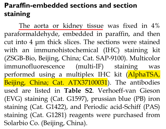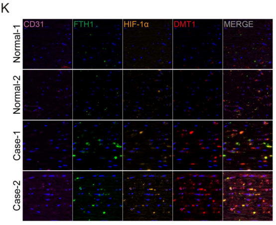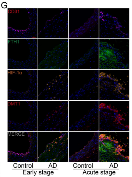 本研究中涉及的mIHC实验(论文中称mIF)使用艾克发生物的AlphaXTSA®多靶点免疫组化染色试剂盒,方案Panel(CD31、FTH1、HIF-1α、DMT1、DAPI)直观显示了通路上关键基因及上皮标志物CD31在正常组和患者AD/AAD组的不同表达情况:与正常对照组相比,AD中FTH1、HIF-1α和DMT1的蛋白水平较高(图3),而且在AAD中更高(图4)。