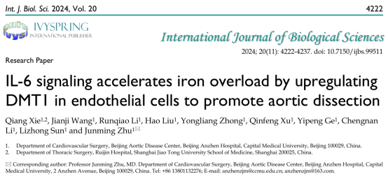 [1]Xie Q, Wang J, Li R, et al. IL-6 signaling accelerates iron overload by upregulating DMT1 in endothelial cells to promote aortic dissection. Int J Biol Sci 2024; 20(11):4222-4237. doi:10.7150/ijbs.99511.