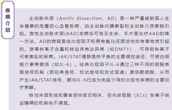 AD只能通过手术治愈,是临床治疗中的一个严重问题。因此,确定AD早期和急性期的药物靶点至关重要。有报道显示铁与心血管疾病和围手术期器官损害的关系,但在这些细胞和组织中精确调节铁离子的研究仍然有限。