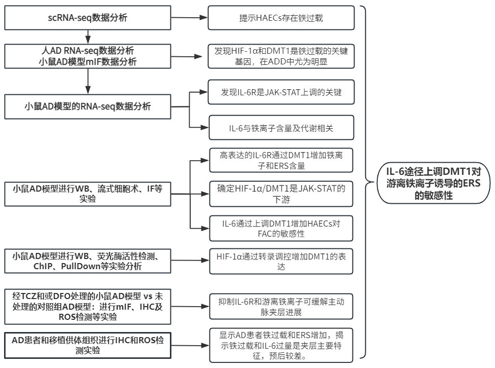 该研究首次通过scRNA-Seq数据确定了AD中特征性的铁过载ECs,采用mIHC等多种方法揭示一种调控机制:激活的IL-6/JAK1/STAT3信号轴通过增加HIF-1α上调DMT1的表达,从而增加细胞内铁离子的积累和组织损伤;并通过比较AD患者围手术期数据与其他患者的数据,发现高游离铁、IL-6和ERS水平是AD患者的特征,且与预后相关。该研究了发现AD的非经典铁调控机制和临床特征,对潜在靶点研究和药物治疗策略具有指导价值。