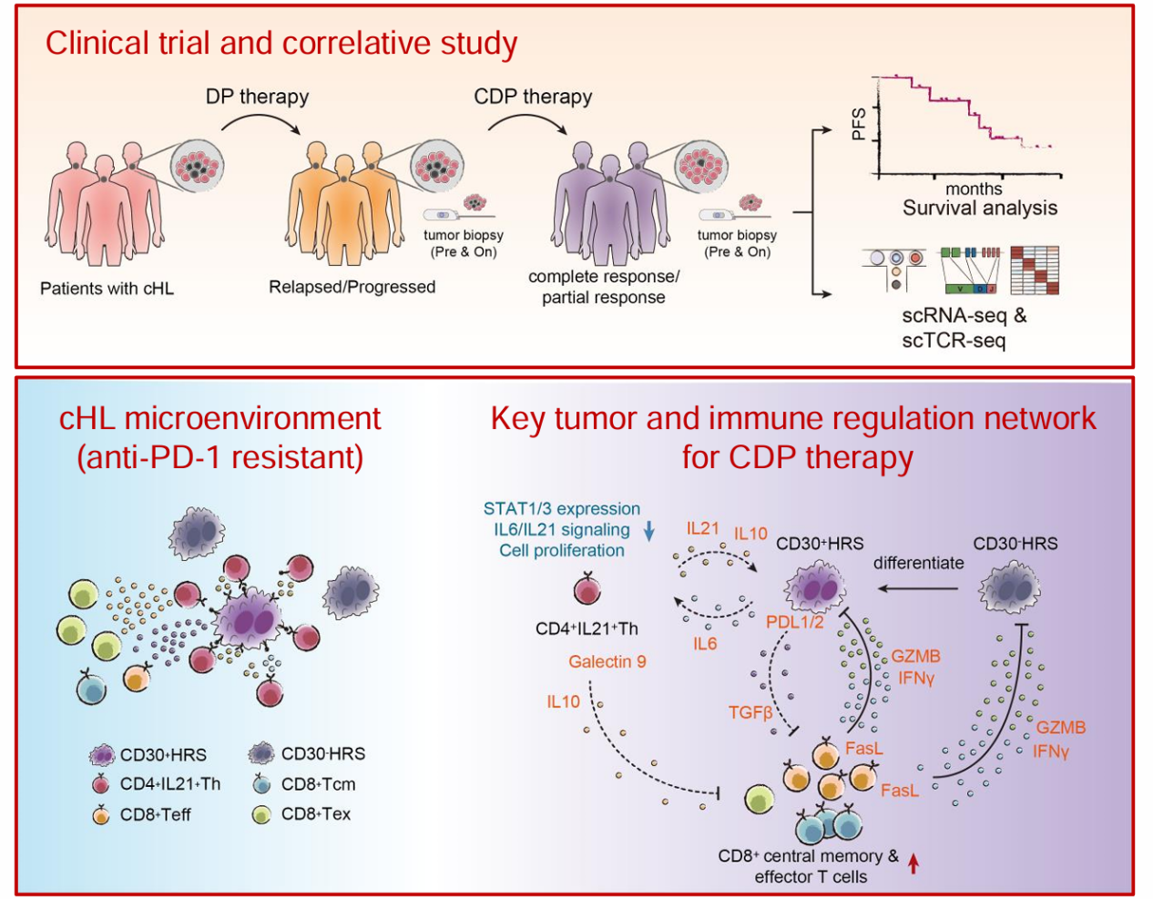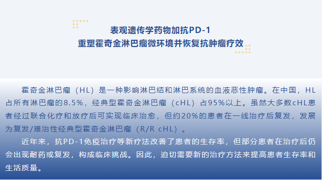 2024年8月2日中国人民解放军总医院韩为东、聂晶研究团队在血液学顶级期刊Blood(IF=21)上发表题为“Epigenetic agents plus anti-PD-1 reshapes tumor microenvironment and restores antitumor efficacy in Hodgkin lymphoma”的研究论文[1]。该研究旨在评估CDP疗法(组蛋白去乙酰酶抑制剂西达本胺、DNA甲基转移酶抑制剂地西他滨和抗PD-1抗体卡瑞利珠单抗)在先前接受过DP疗法(地西他滨加卡瑞利珠单抗)后复发/进展的cHL患者中的安全性和有效性,这对于治疗方案的开发和改善DP治疗后复发患者的预后意义重大,同时通过肿瘤微环境解析指出 HRS 肿瘤异质性,阐释表观免疫治疗 cHL 抗瘤效能关键作用机理——靶向CD30- HRS样细胞治疗和阻断IL-21通路,这也为其他肿瘤免疫治疗奠定理论基础。