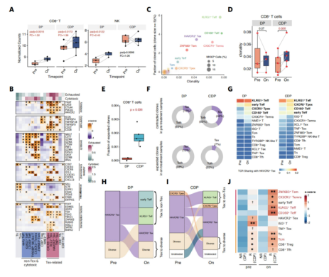 研究者观察到在经过CDP治疗后CD8+ T细胞显著增加,而NK细胞没有明显变化。通过对T/ILC细胞的重新聚类分析,识别出五个高表达PDCD1的CD8+T细胞簇,其中一个被标记为CD8+滤泡辅助T细胞(CD8+Tfh),其余四个则表现出耗竭表型但仍具细胞毒性。CDP治疗后,整体CD8+T细胞的克隆性显著增加,在对CDP治疗有反应的肿瘤中克隆数发生扩增的较多,减少的克隆中耗竭T细胞(Tex)占比较高,表明CDP治疗减轻了T细胞的耗竭现象。此外HAVCR2+Tex细胞显示出高细胞毒性和克隆性,可能具有肿瘤反应性。CDP治疗后,多个非耗竭细胞毒性簇与HAVCR2+Tex表现出高TCR共享,进一步支持CD8+T细胞向非耗竭效应状态转变的假设。CD8+T细胞簇与临床反应的关联分析显示,CDP治疗后高细胞毒性的簇显著增加,同时HAVCR2+Tex在治疗前已丰富,提示先前治疗激活了肿瘤反应性T细胞,但其他因素可能阻碍了有效的抗肿瘤免疫反应。