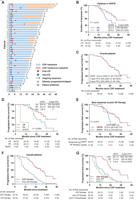 截至2023年12月10日,52名接受CDP(西达本胺-地西他滨-卡瑞利珠单抗)联合治疗的患者中,94%获得客观反应,50%达到了完全缓解(CR)。中位治疗周期为20次,持续时间21个月。对于至少接受5次前期治疗的患者,客观反应率为90%。在中位随访32个月后,12名持续CR的患者停用CDP治疗,且所有患者存活。中位无进展生存期(PFS)为29.4个月,1年和2年的PFS率分别为94%和60%。常见的不良事件包括白细胞减少(73.1%)和腹泻(36.5%),无患者因不良事件停止治疗。总体来看,CDP治疗显示出良好的疗效和安全性。