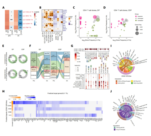 经过CDP治疗后,CD4+T细胞中的IL21+辅助T细胞(Th细胞)在响应者中显著减少,而在非响应者的肿瘤中的丰度在治疗前和治疗期间均较高。且这些细胞表现出高水平的IL21及CXCR5、PDCD1和ICOS,显示出类似滤泡辅助T细胞(Tfh)的表型,暗示其可能具有免疫抑制功能。分化轨迹表明IL21+ Th细胞与前Tfh细胞形成分支,IL21+Th细胞的扩增克隆在DP组中增加,而CDP组则抑制了这些细胞的扩增,促使其停留在靠前的分化状态。同时,CD30+ HRS样细胞与IL21+ Th细胞之间存在多种相互作用,包括细胞因子分泌和受体表达,可能通过IL6和CD40对IL21+Th细胞产生调节作用。IL21+Th细胞通过分泌IL10等配体也可能调节CD30+HRS细胞的生存,形成正反馈环路,促进肿瘤的生长和免疫逃逸,这一机制的发现为后续治疗策略提供了潜在靶点。