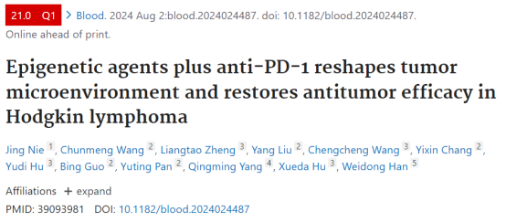 [1]Nie J, Wang C, Zheng L, Liu Y, Wang C, Chang Y, Hu Y, Guo B, Pan Y, Yang Q, Hu X, Han W. Epigenetic agents plus anti-PD-1 reshapes tumor microenvironment and restores antitumor efficacy in Hodgkin lymphoma. Blood. 2024 Aug 2:blood.2024024487. doi: 10.1182/blood.2024024487. Epub ahead of print. PMID: 39093981.