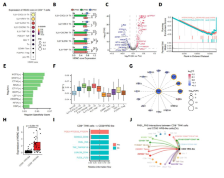 研究者为了进一步揭示CDP治疗的机制,重点分析了IL21+Th细胞和CD30- HRS样细胞的变化。结果表明CDP治疗后IL21+Th细胞的组蛋白去乙酰化酶(HDAC)评分显著高于非响应患者,表明IL21+Th细胞可能是CDP治疗的直接靶点。治疗后,IL21+Th细胞的基因表达和信号通路活性显著下降,特别是与IL21和IL6相关的信号通路,关键转录因子STAT1/3和IKZF3的表达也显著降低。此外,CD30-HRS样细胞的HDAC评分较低,表明CDP治疗对CD30-HRS样细胞可能有间接影响,CDP治疗增强了CD8+ T细胞/NK细胞与CD30-HRS细胞之间的相互作用,激活了细胞毒性反应。总体来看,CDP治疗通过改变IL21+Th细胞的表型和功能,抑制了对CD30+HRS细胞的免疫支持,并提高了CD30-HRS细胞的免疫原性和细胞毒性反应,从而改善了cHL患者的免疫环境和治疗效果。