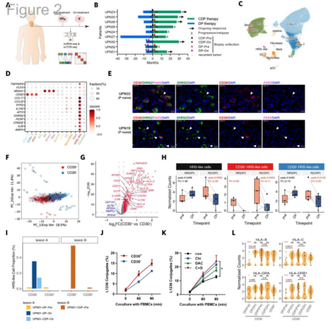 研究者通过五组对CDP疗法有响应的肿瘤和三组对DP疗法有抗性的肿瘤进行治疗相关分析,以探索逆转抗PD-1抗性的关键因素。研究结果表明响应CDP疗法的肿瘤中总HRS样细胞的数量显著减少,而对DP疗法无响应的肿瘤中未观察到减少。这一发现表明,CD30- HRS样细胞在CDP治疗后数量减少,提示它们可能对抗PD-1的免疫疗法敏感性较低,研究者通过进一步的患者案例验证了这一假设,在DP治疗失败后,有观察到CD30- HRS样细胞的转录表型转变为CD30+ HRS样细胞。研究者使用表观遗传药物如西达本胺和地西他滨处理L1236 HL细胞系,导致HLA基因表达增加,进一步增强了免疫识别能力,然而研究表明仅依靠HLA基因的上调可能不足以完全消除肿瘤,仍需其他免疫调节作用来增强抗肿瘤效果。总的来说,这些结果提示了CDP方案在DP治疗失败后的有效性可能与CD30-HRS样细胞的耗竭有关,同时强调了表观遗传药物在增强免疫识别中的潜力,但也指出了需要综合多种策略来提高疗效。