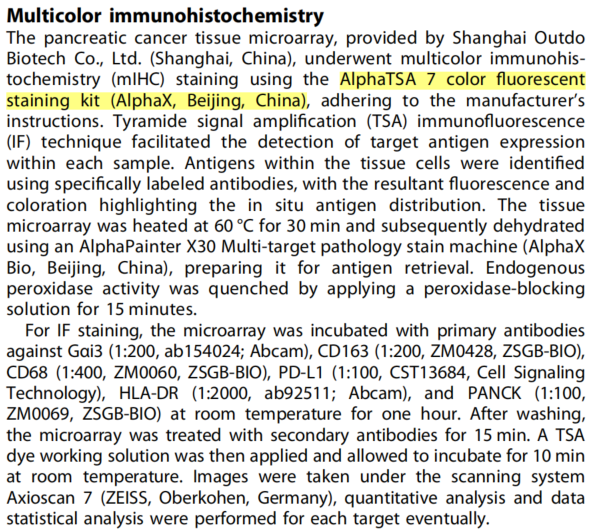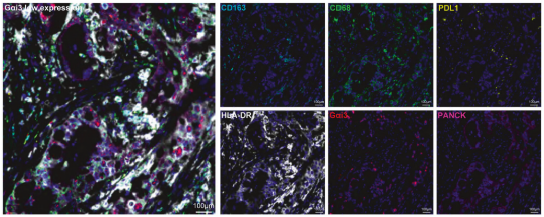本研究中涉及的mIHC实验由艾克发生物团队提供技术支持,其中panel(CD163、CD68、PD-L1、HLA-DR、Gαi3、Panck、DAPI)证实了Gαi3的高表达与胰腺癌组织中的M1型巨噬细胞比例降低相关,而M2型巨噬细胞的比例未见显著变化,表明Gαi3可能通过调节巨噬细胞的类型影响肿瘤微环境;在Gαi3高表达的胰腺癌组织中,检测到PD-L1阳性细胞的增加,这可能与肿瘤的免疫逃逸机制有关。