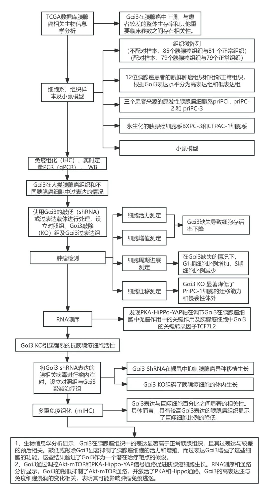 胰腺癌(尤其是胰腺导管腺癌,PDAC)恶性程度高,5年生存率不足10%,全球死亡率不断上升,缺乏有效治疗靶点。此癌症由于其侵袭性和难以治疗,导致早期诊断和有效治疗极具挑战性,患者的预后普遍较差。Gαi3是G蛋白α亚基家族成员,此前在部分肿瘤中被报道参与细胞增殖和迁移,但在胰腺癌中的作用尚不明确。此外,关于Gαi3在调控胰腺癌细胞生长以及免疫微环境中的作用仍需进一步探讨。